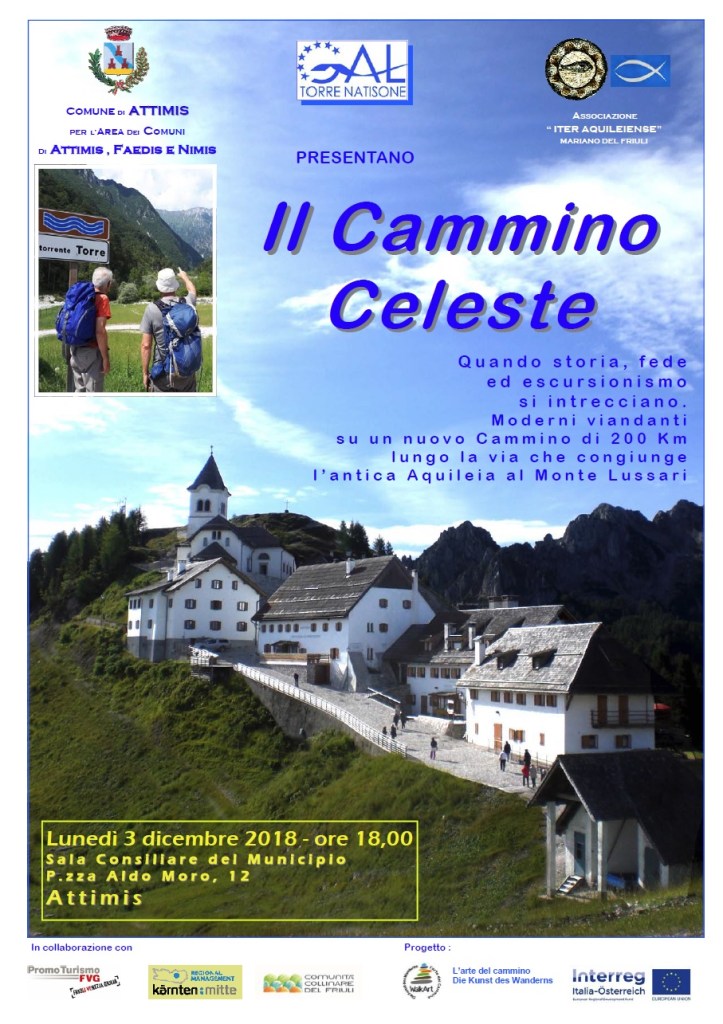 Il Cammino Celeste è un percorso di pellegrinaggio che si snoda tra Aquileia e il Monte Lussari, per poi raggiungere anche Austria e Slovenia. In territorio GAL, incastonate tra le colline e le Prealpi, si trovano 4 tappe (Castelmonte, Masarolis, Montemaggiore e Rifugio ANA Monteaperta). Grazie alla collaborazione tra l’Associazione Iter Aquileiense, i Comuni di Attimis, Lusevera, Taipana e Prepotto e il GAL, verranno organizzate delle serate di presentazione, durante le quali potrete vedere più da vicino le potenzialità che il Cammino Celeste può offrire allo sviluppo del nostro territorio.