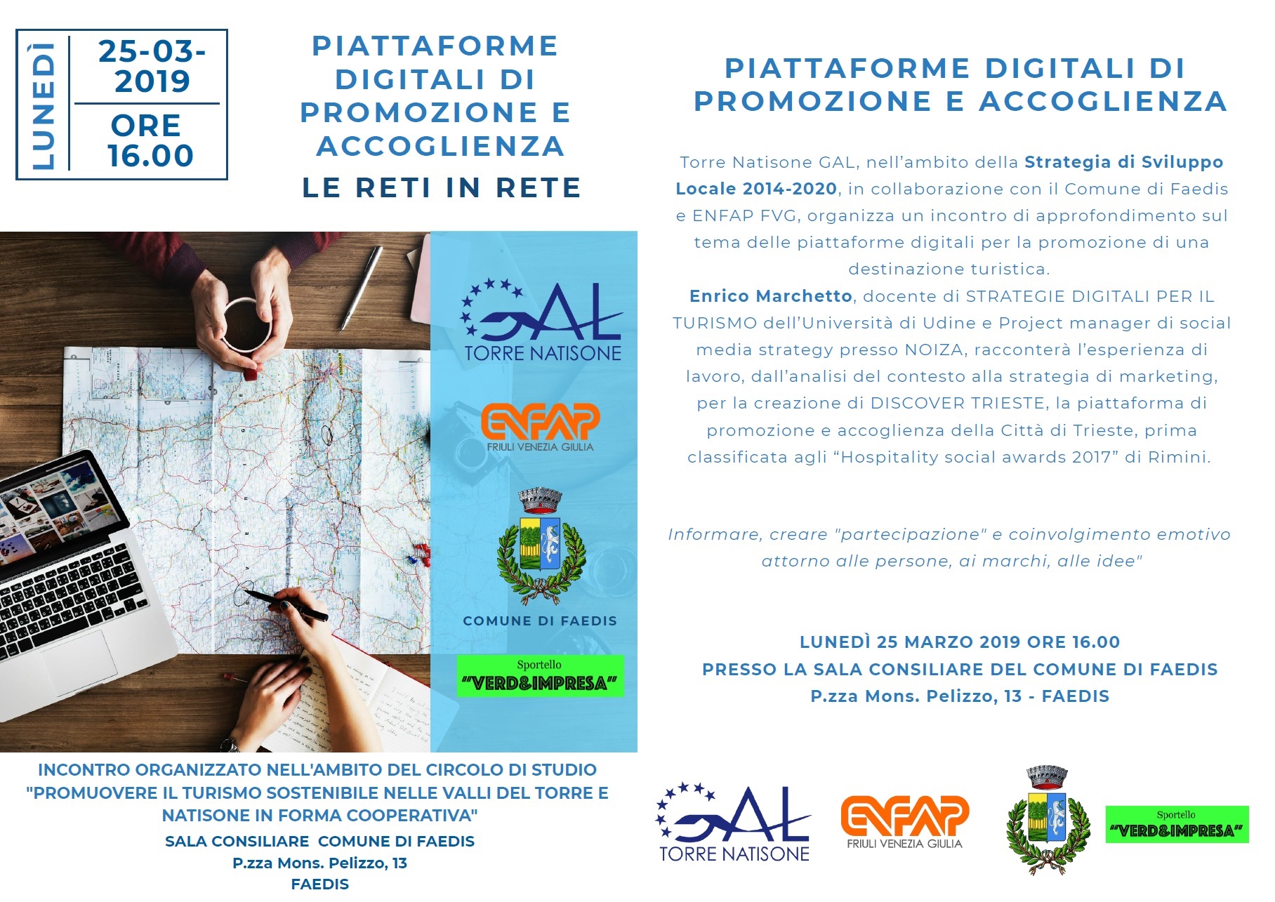 Lunedì 25 marzo alle ore 16.00, presso la Sala Consiliare del Comune di Faedis in Piazza Mons. Pelizzo 13, il Torre Natisone GAL in collaborazione con il Comune di Faedis (Sportello Verd&Impresa) e ENFAP FVG, organizza un incontro di approfondimento sul tema delle piattaforme digitali per la promozione di una destinazione turistica.